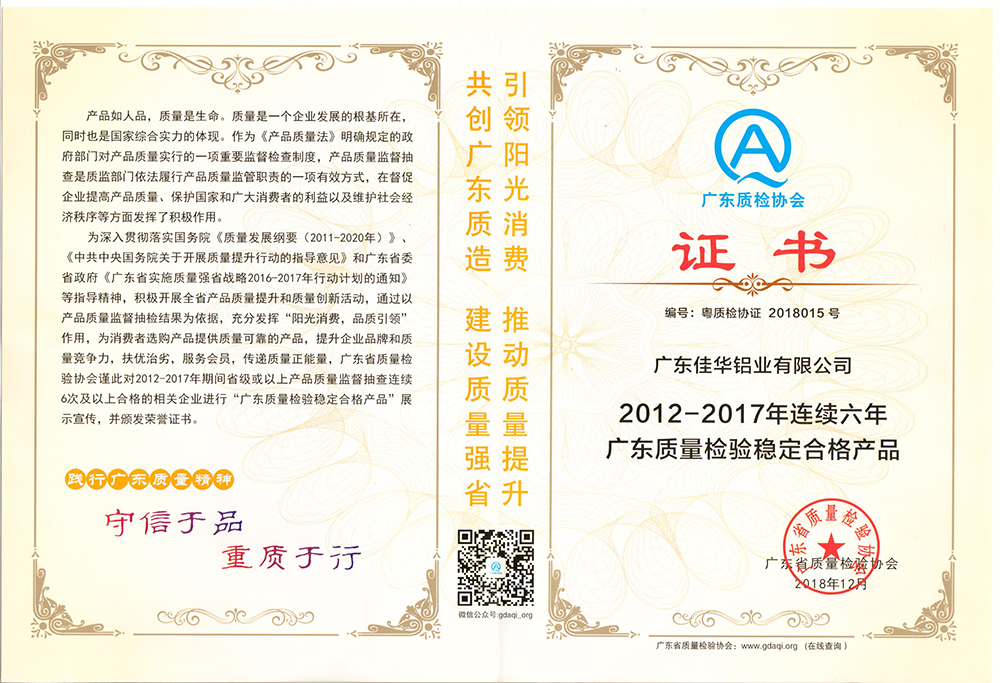 2018年12月,佳華鋁業(yè)再次榮獲“2012-2017年連續(xù)六年廣東質(zhì)量檢驗穩(wěn)定合格產(chǎn)品”證書,體現(xiàn)了行業(yè)對于佳華鋁業(yè)產(chǎn)品質(zhì)量的認可。
