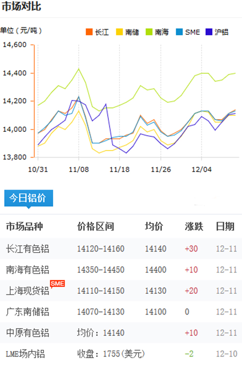 鋁錠價格今日鋁價2019-12-11
